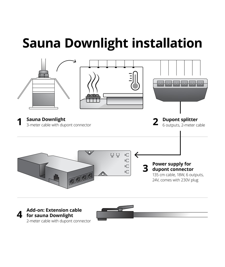 Met zijn compacte afmetingen en eenvoudige aansluiting op een 24V DC voeding, biedt deze sauna downlight een gemakkelijke installatie en een minimalistische esthetiek die perfect past bij moderne sauna-interieurs.