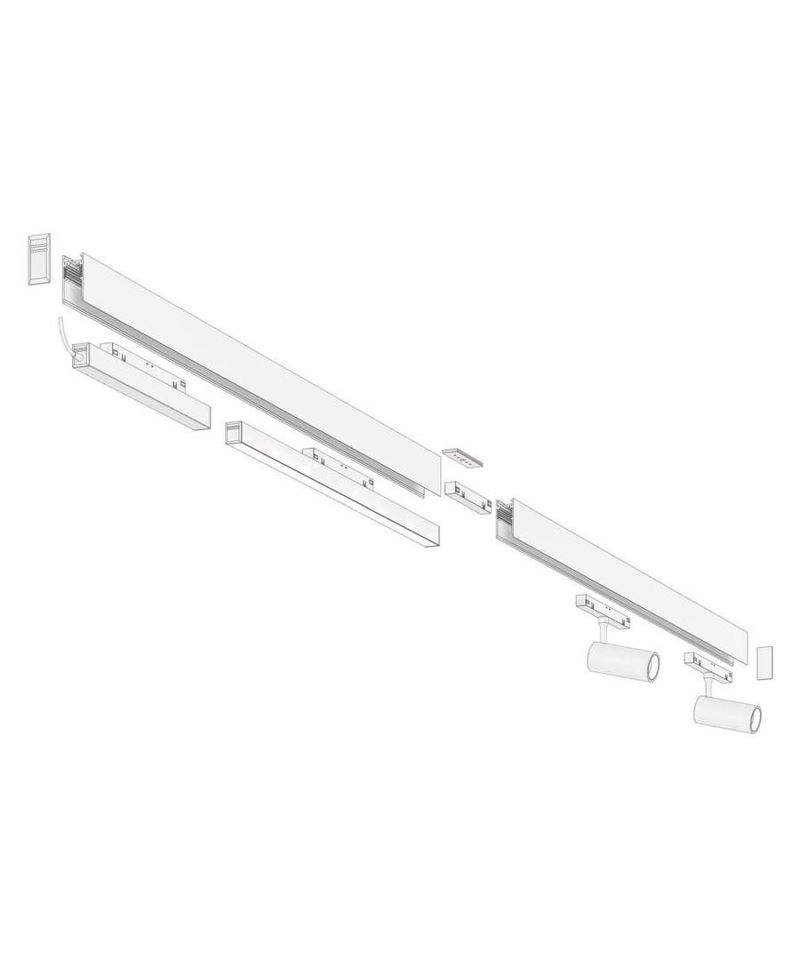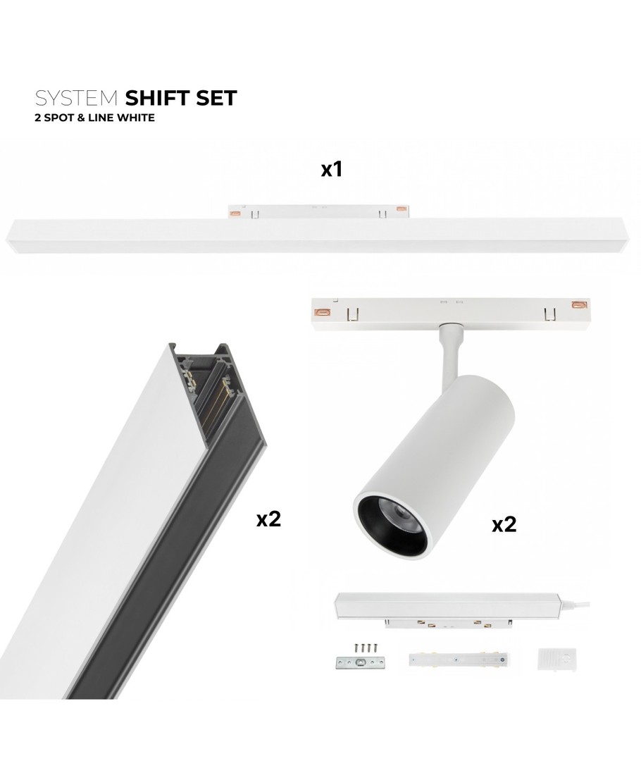 In deze SHIFT set krijg je 2x 1 meter rail, 2 LED spots en een lichtrail, evenals alles wat je nodig hebt om de set te installeren.