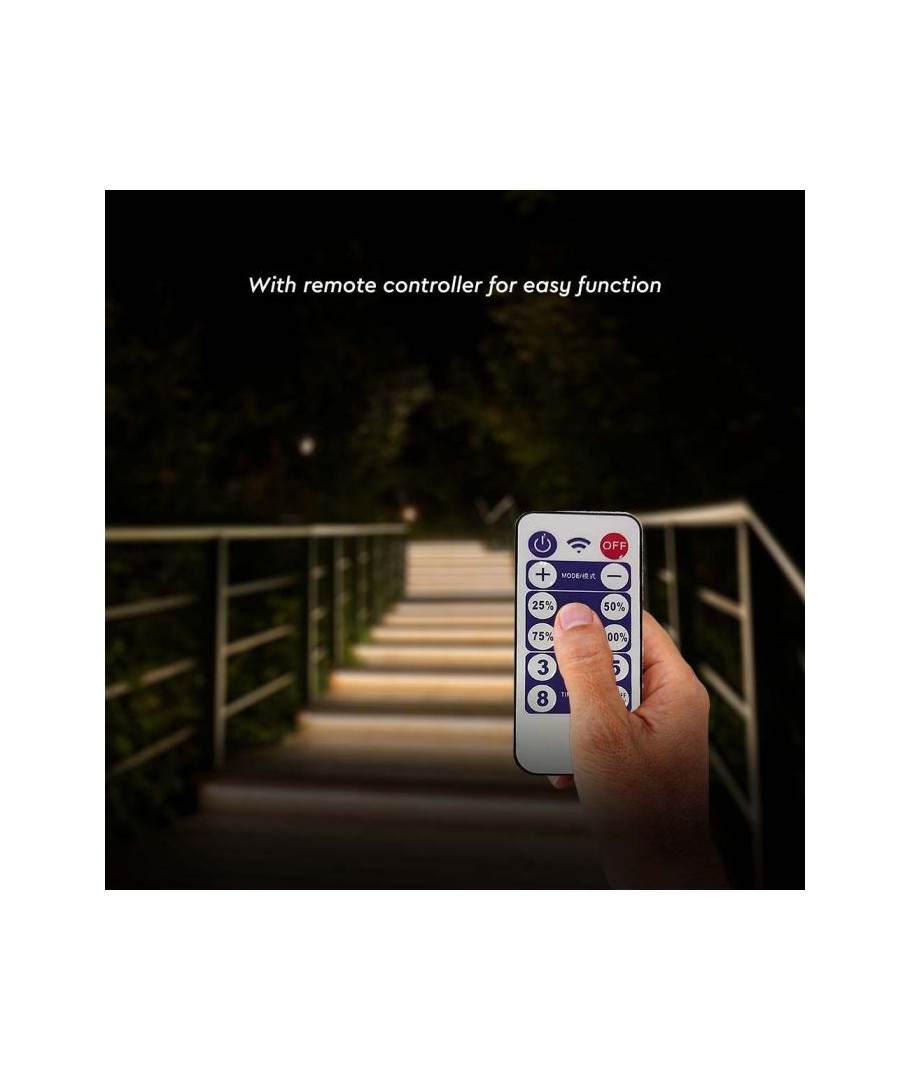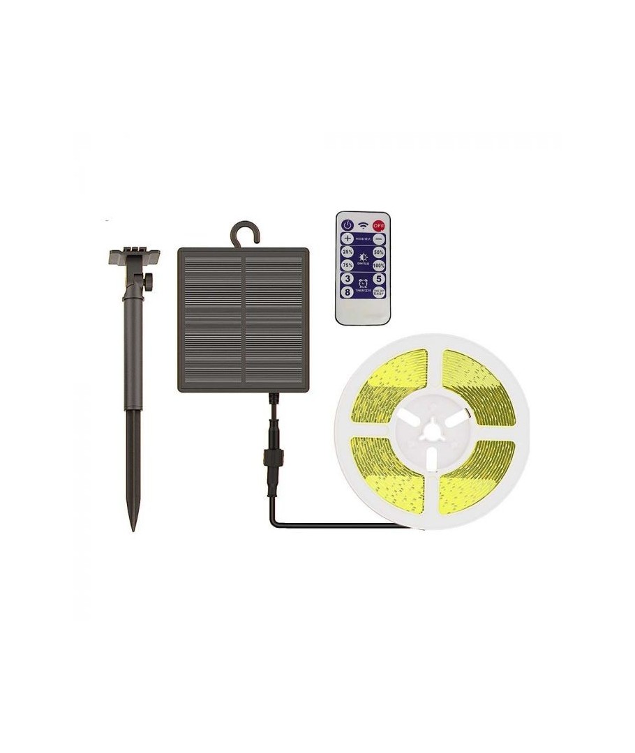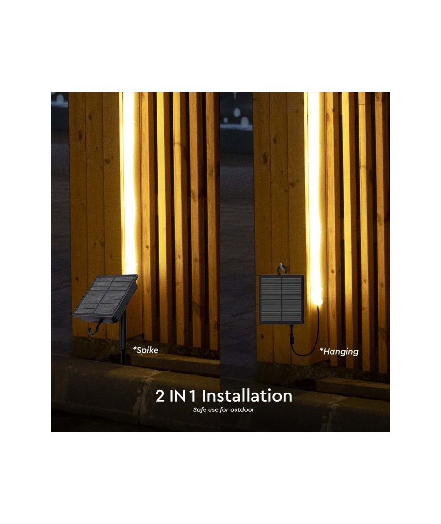 Deze 5 meter lange strip is perfect voor tuinen, entreegebieden en andere buitenruimtes. Met zijn IP67-classificatie is hij beschermd tegen stof en water, zodat hij zelfs de meest uitdagende weersomstandigheden aankan. Met de meegeleverde afstandsbediening kun je eenvoudig de lichtintensiteit regelen  en de juiste sfeer creëren. Het zonnepaneel maakt het gemakkelijk om het meegeleverde zonnepaneel te installeren en te plaatsen, omdat het opgehangen kan worden of met een pin in de grond kan worden gezet.