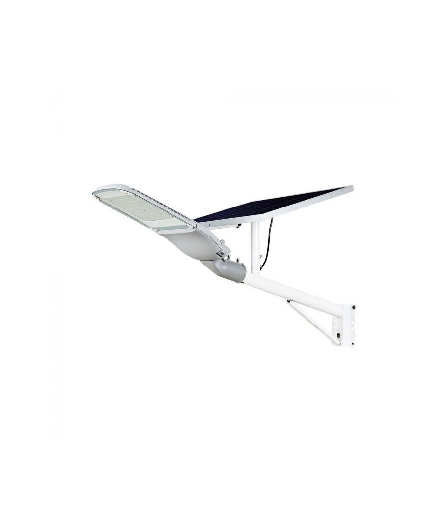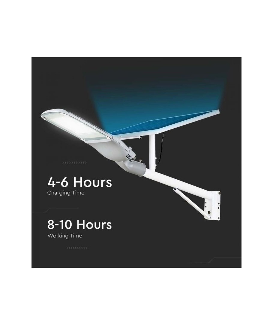 Deze witte straatlamp is uitgerust met een zonnepaneel dat de lampaccu oplaadt en je de mogelijkheid geeft om te verlichten zonder elektriciteit te gebruiken.
