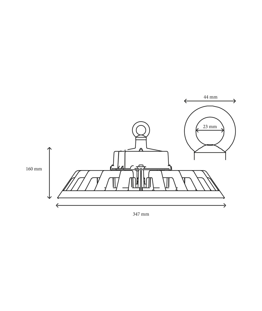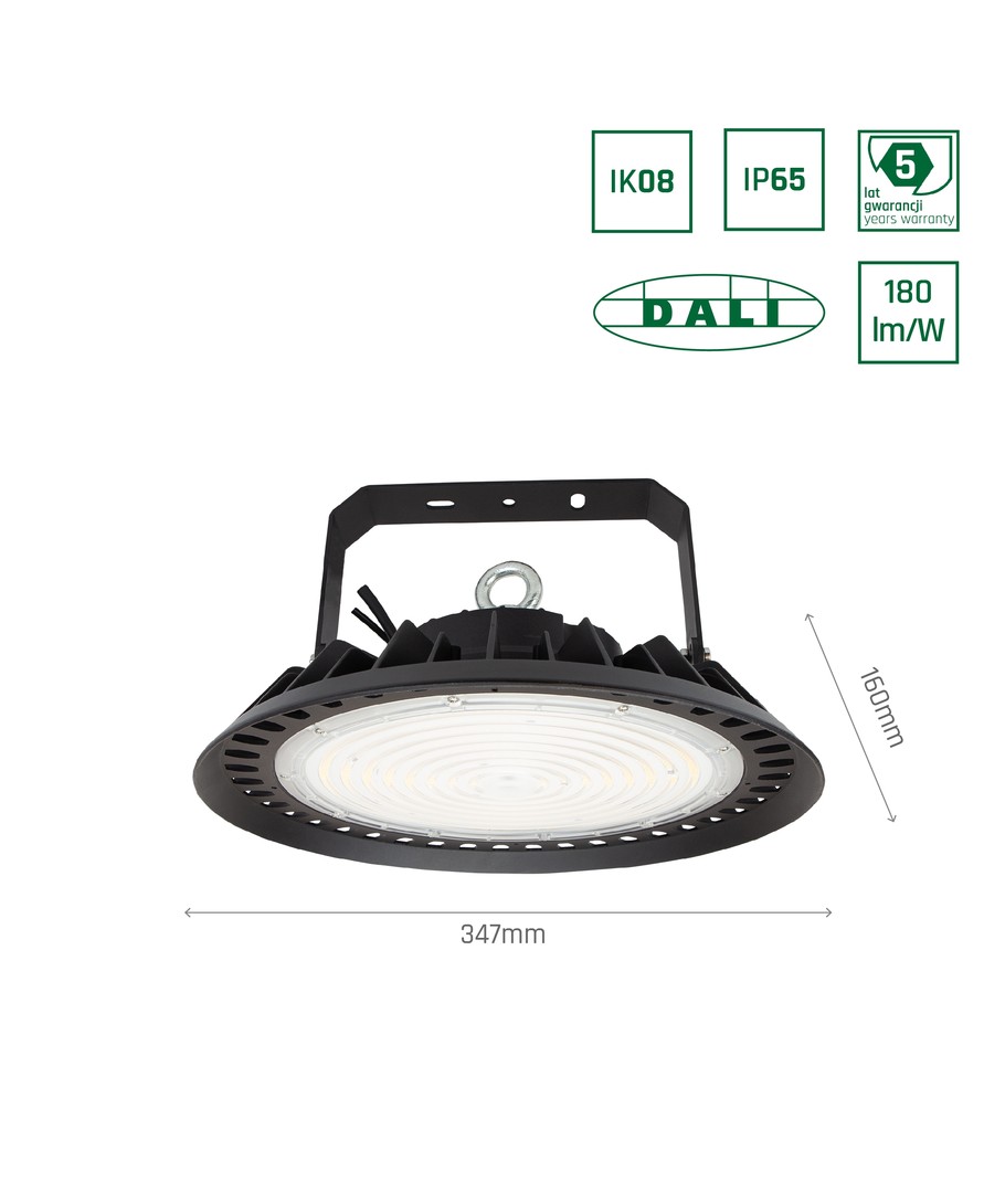 De PLATEO 3 High Bay meet 347 x 160 mm en is vervaardigd in een elegante zwarte afwerking. Hij is geclassificeerd met IP65, wat betekent dat hij geschikt is voor buitengebruik en bestand is tegen waterdruppels en regen. Daarnaast heeft hij een IK08 classificatie, die bescherming biedt tegen mechanische invloeden.