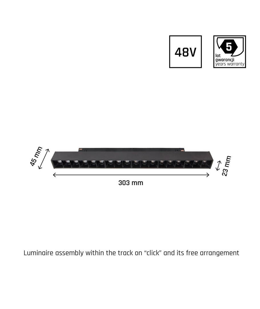 De lamp meet 303 x 23 x 42 mm, waardoor hij compact is en gemakkelijk in elke ruimte te integreren. Met een geïntegreerde lichtbron is de installatie eenvoudig en snel.