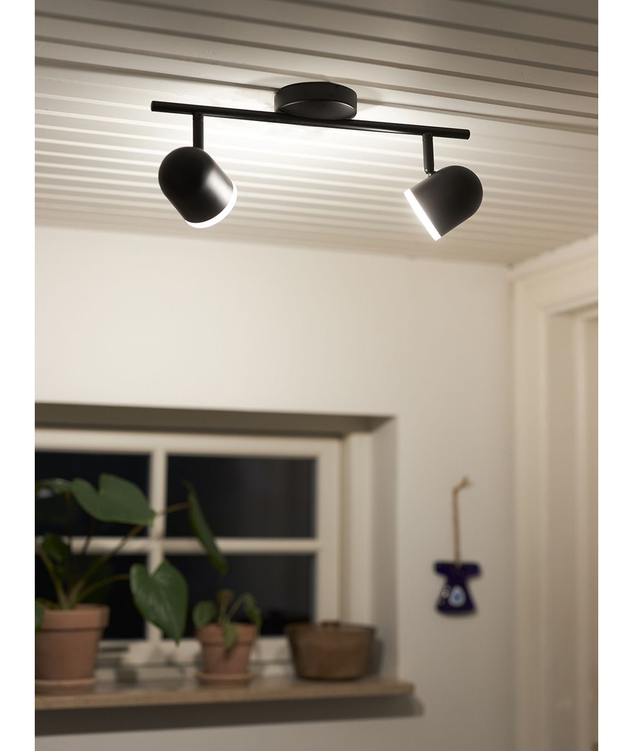 Teater is de naam van deze nieuwe serie plafondlampen van het Deense Nielsen Light - mooie 2-spot in een stijlvolle matzwarte kleur, gemonteerd op een stang.