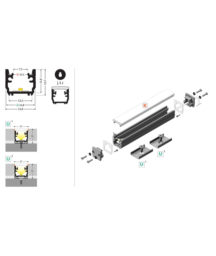 1m aluminium profiel FLOOR12 K/U is een speciale LED-rail ontworpen voor tegelinstallaties.
