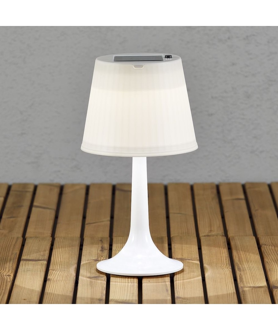De Assisi LED tafellamp heeft een ingebouwde batterij die wordt opgeladen via de zonnecellen bovenop de lampenkap, waar ook de aan/uit-knop zit. Hij is gemaakt van wit kunststof en ziet eruit als een traditionele binnentafellamp met retro-referenties.