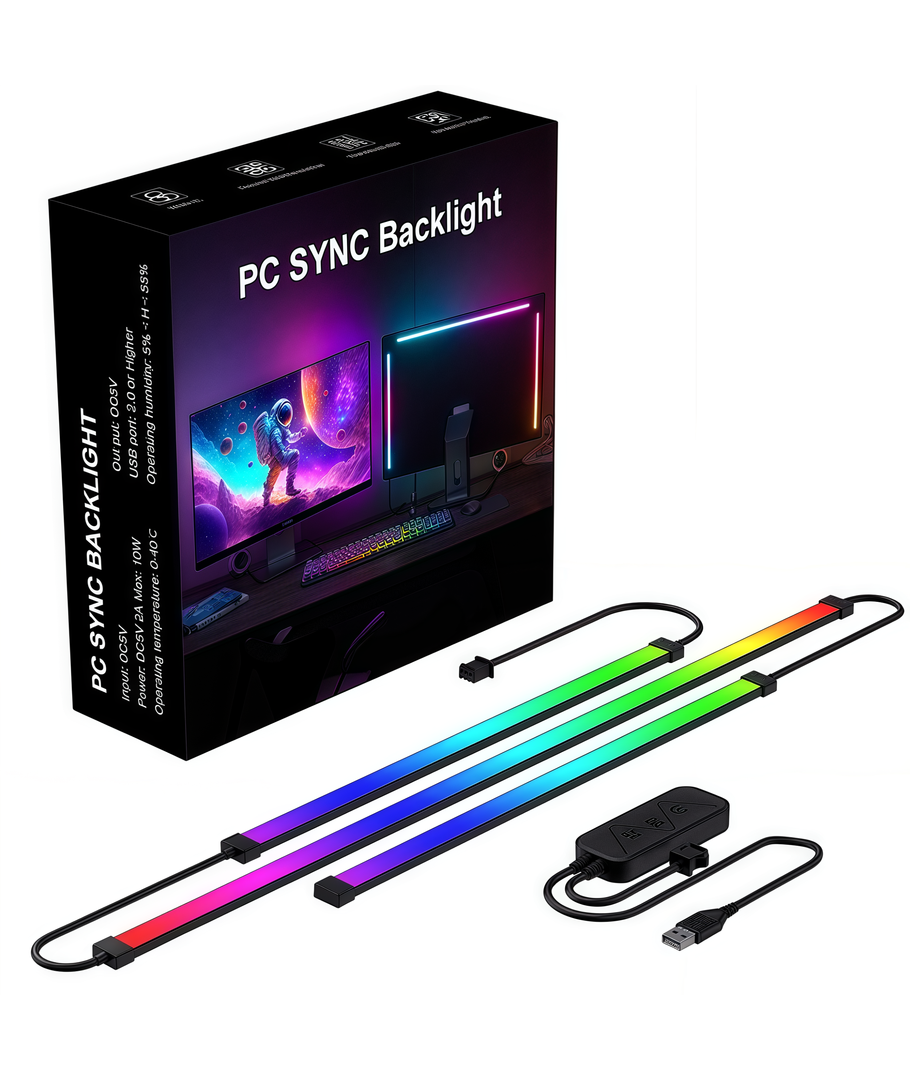 Breng nieuw leven in je setup met RGBIC LED Achtergrondverlichting voor PC-schermen, die het licht in realtime synchroniseert met je gameplay of muziek. Perfect voor gamers die een intensere, kleurrijkere en sfeervollere ervaring voor het scherm willen.