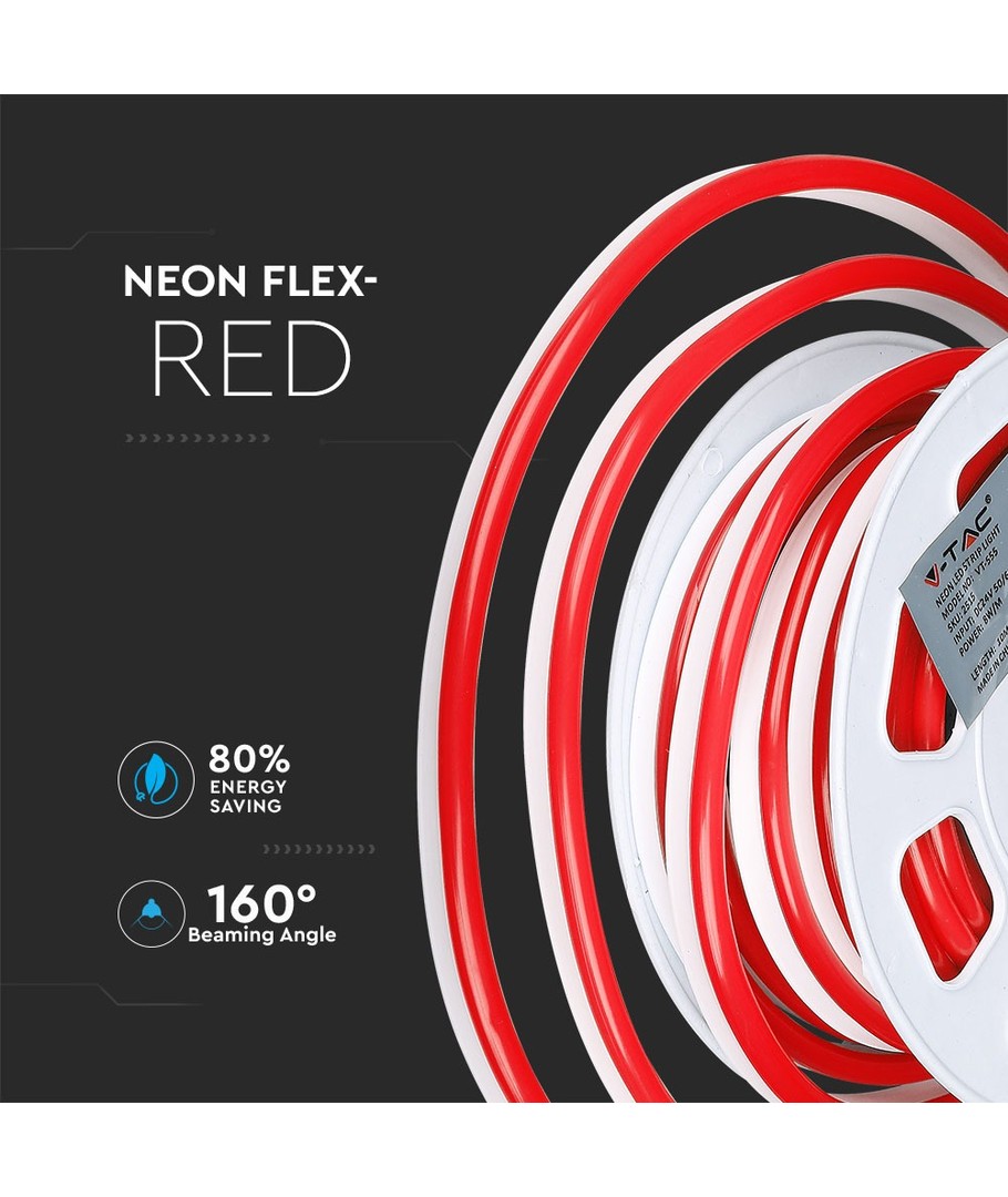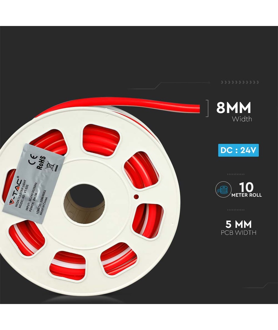 Ervaar de veelzijdige en duurzame 8W/m Neon Flex 24V in een opvallende rode kleur, geleverd op een handige 10 meter rol. Met een vermogen van 8W en een lichtsterkte van 320 lumen is deze neon flex een fantastische keuze voor zowel binnen- als buitenprojecten.