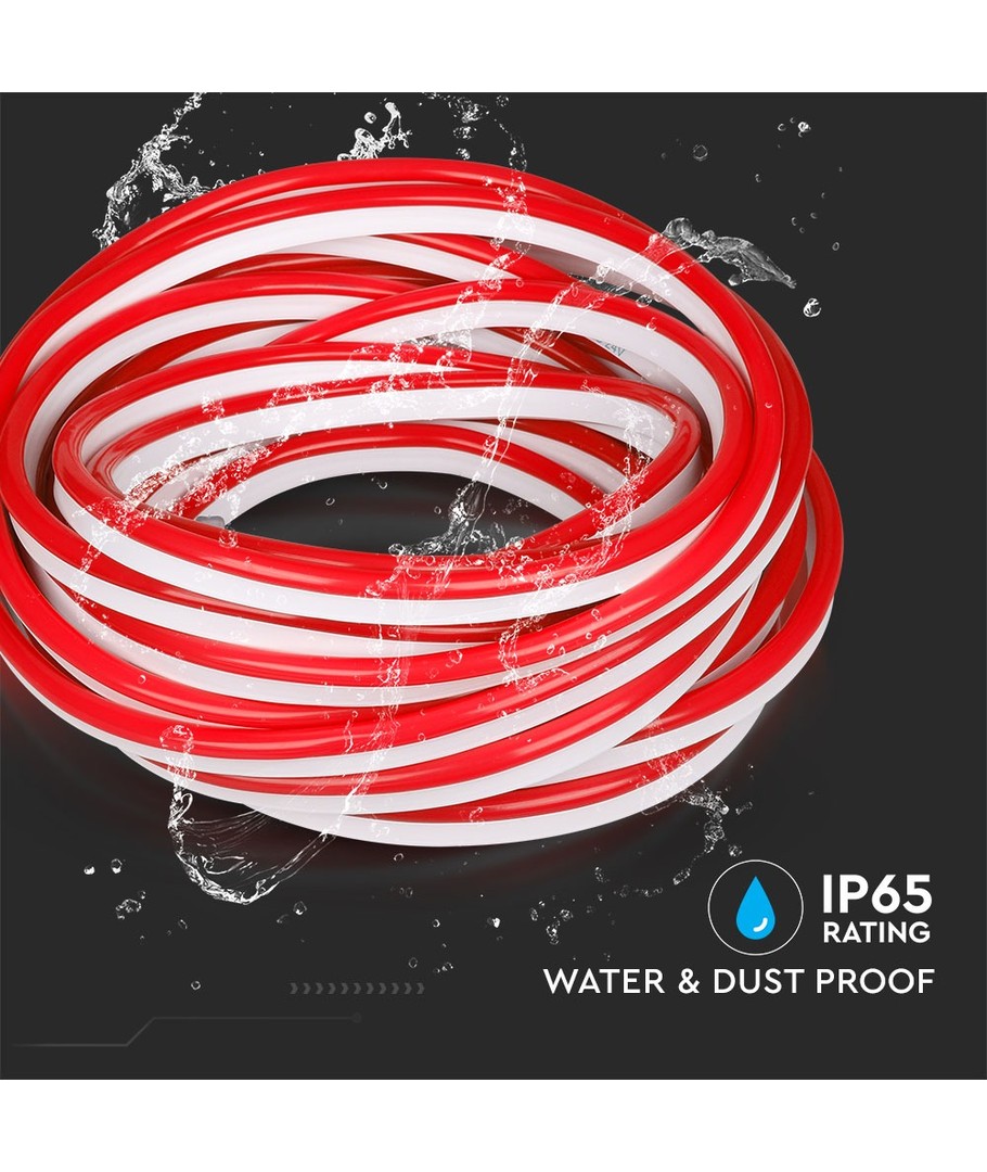 Met een IP65 classificatie is de neon flex ontworpen om zowel waterdruppels als regen te weerstaan. Perfect voor gevels, borden of tuinverlichting, waar de verlichting een unieke sfeer toevoegt en tegelijkertijd robuust genoeg is om de meeste weersomstandigheden te doorstaan.