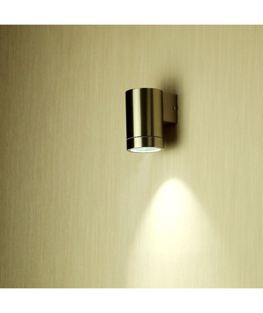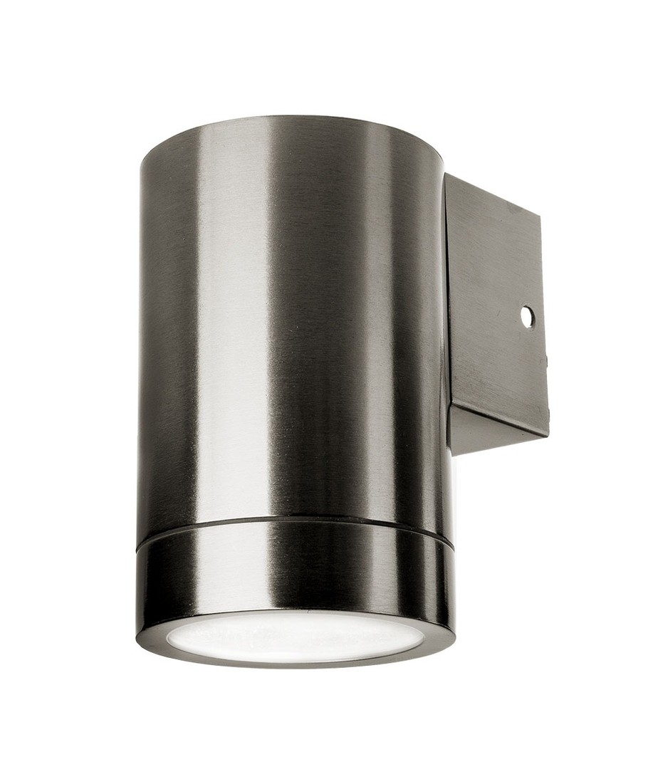 1-wegs wandlamp in GU10-formaat met behuizing van roestvrij staal en IP44, geschikt voor buitengebruik.