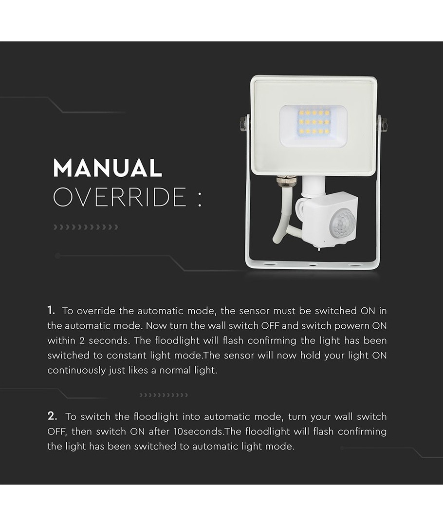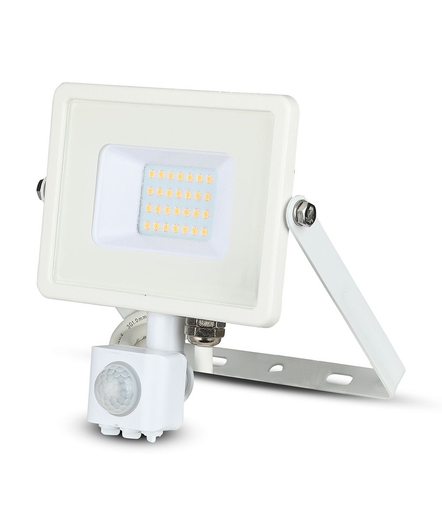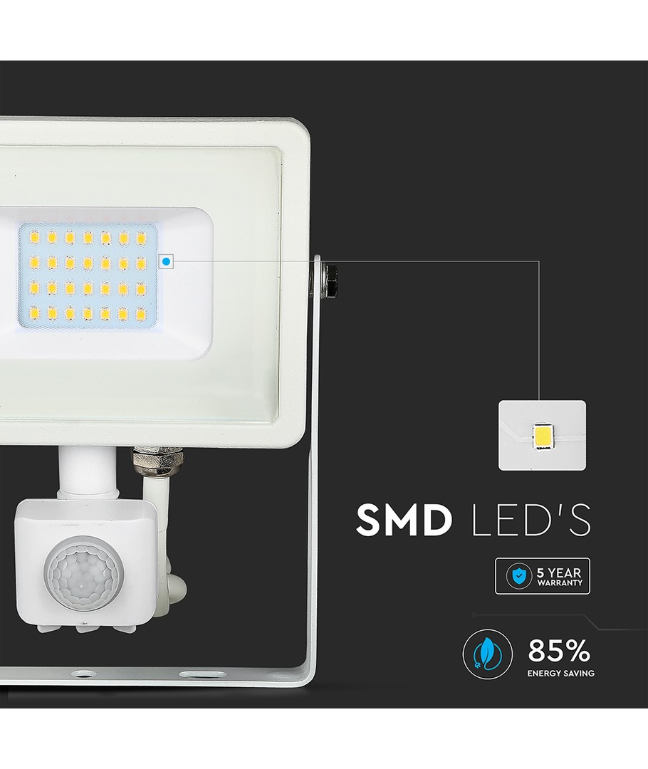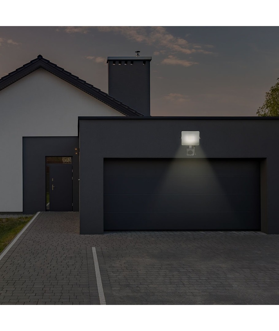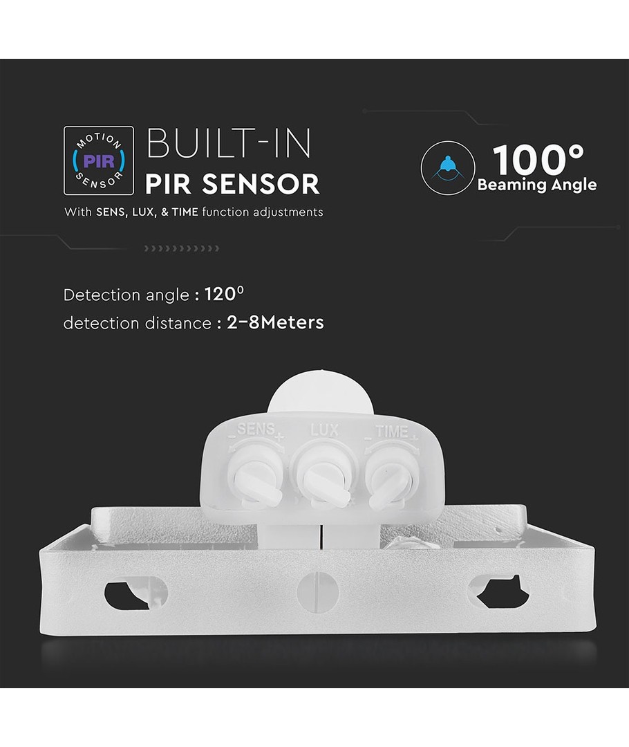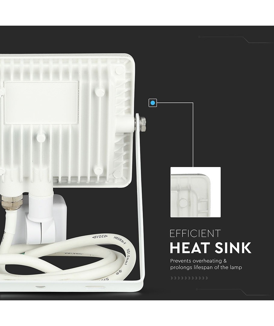 De schijnwerper wordt geleverd in een witte behuizing en heeft een IP65 classificatie, wat betekent dat hij geschikt is voor buitengebruik en bestand is tegen waterdruppels en regen. Dit zorgt ervoor dat de schijnwerper zowel functioneel als duurzaam is onder alle weersomstandigheden.