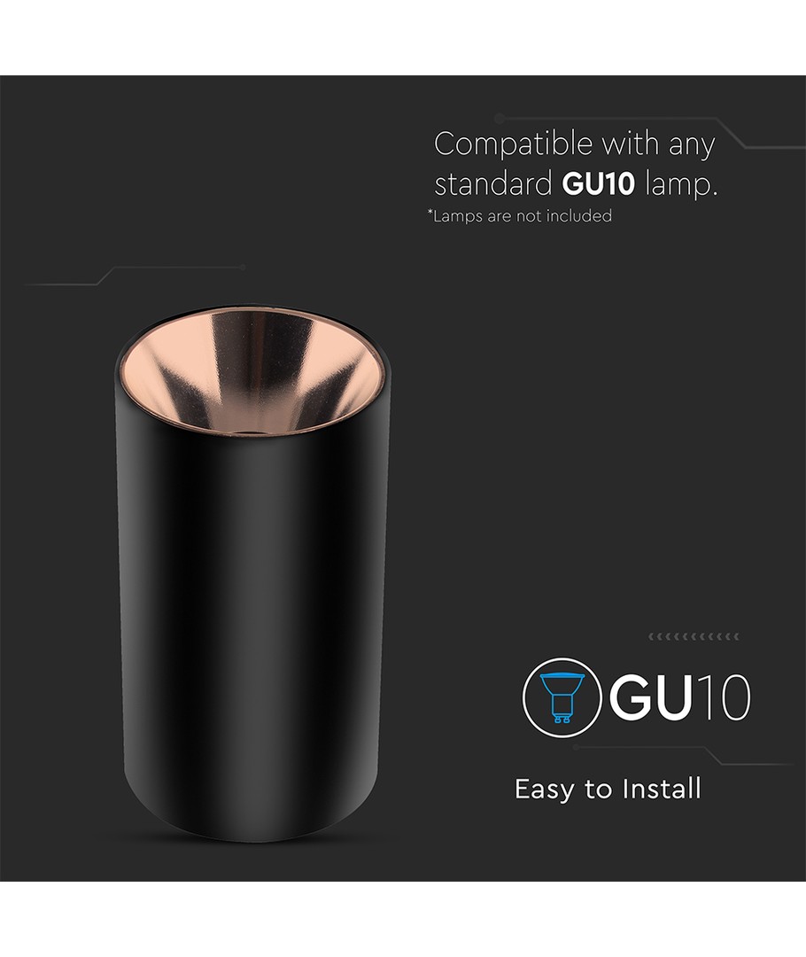 Deze elegante GU10-lamp is perfect om een moderne touch aan uw interieur toe te voegen. Met zijn ronde vorm en de combinatie van zwart en roségoud wordt de lamp een stijlvol element in elke ruimte.