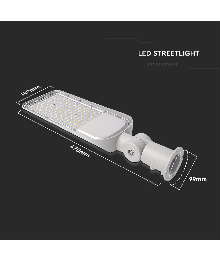 De lampbehuizing heeft de afmetingen 470 x 99 x 149 mm en is ontworpen om zware buitenomstandigheden te weerstaan. Met een IP65 classificatie kan deze LED straatlamp veilig buiten worden gebruikt, omdat hij beschermd is tegen waterdruppels en regen.