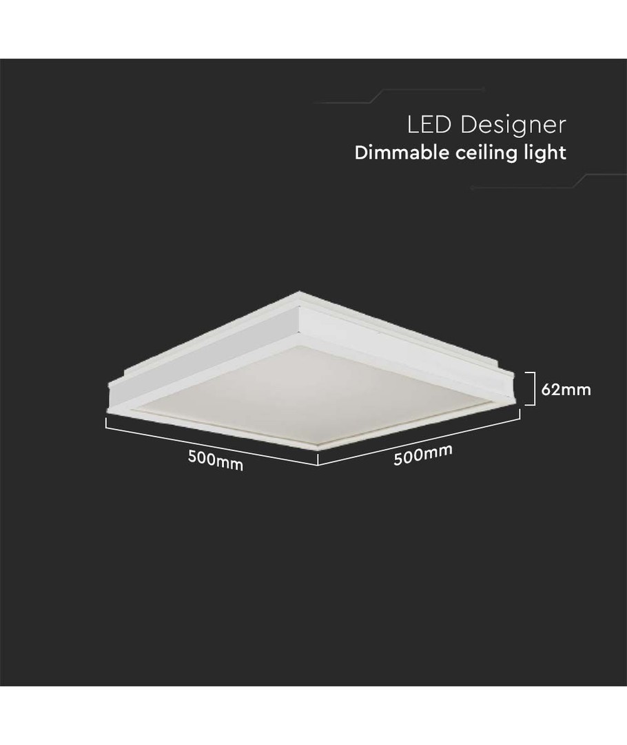 Het ontwerp heeft een vierkante vorm van 500 x 62 x 500 mm, wat zorgt voor een discrete en elegante uitstraling in elke ruimte. Let op: de lamp heeft een IP20 classificatie, wat betekent dat hij niet waterbestendig is.