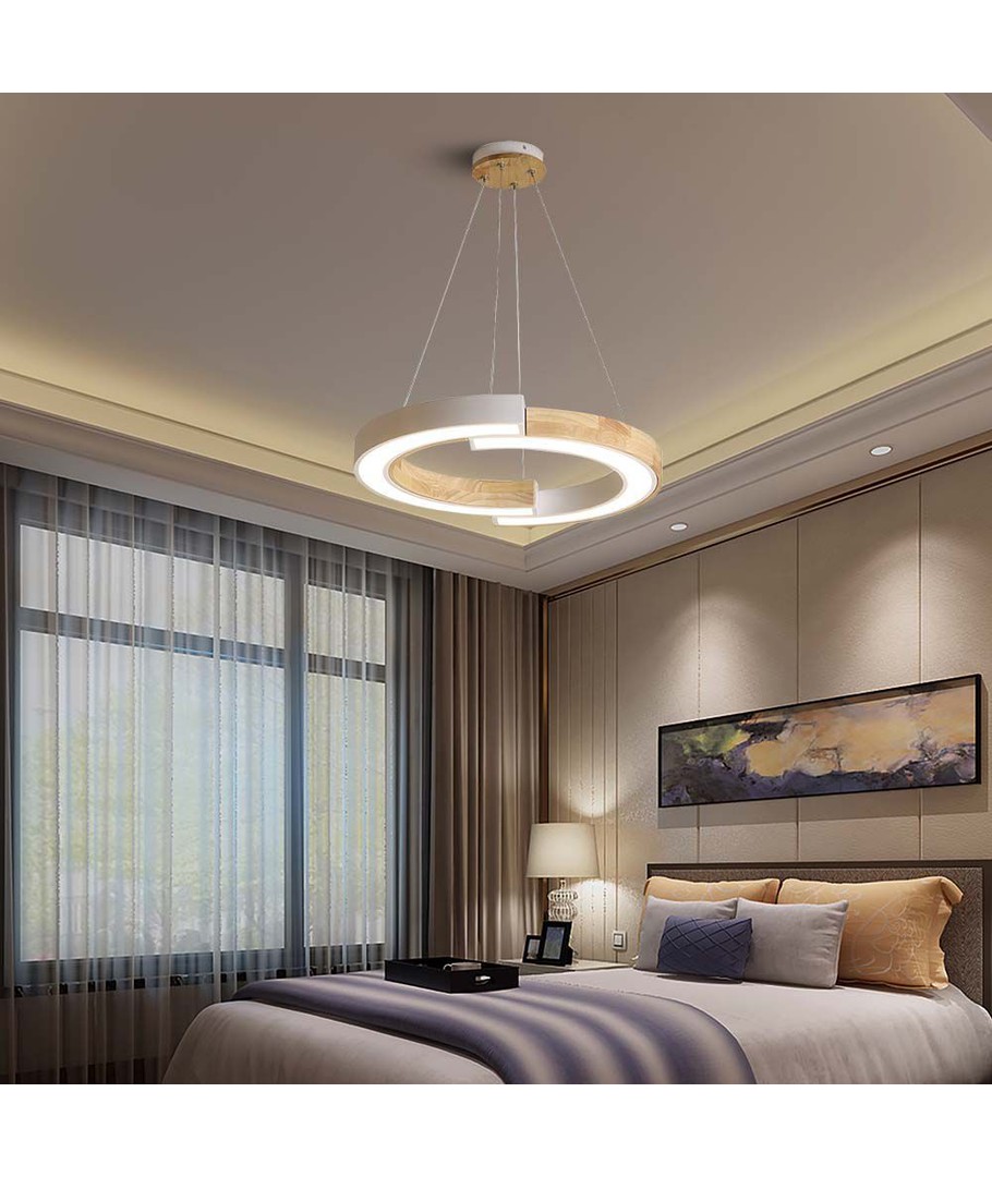 De afmetingen van 1120 x 370 x 430 mm geven de lamp een opvallende aanwezigheid zonder de ruimte te overheersen. De elegante combinatie van wit en hout geeft een tijdloze uitstraling die in veel verschillende interieurstijlen past.