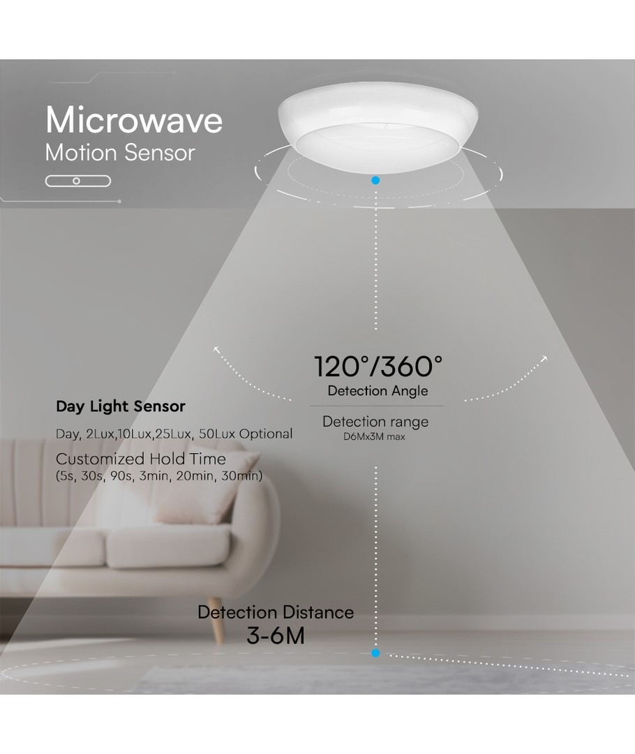 | Aanvullende opmerkingen | Light-on duration: 5s, 30s, 90s, 3min, 20min, 30min. Sensor type: Microwave Sensor. Sensor angle: 360°Ceiling/120°Wall Mounted. Sensor distance: 3-6M. Ambient light level: Day,2lux,10lux,25lux,50lux optional. |