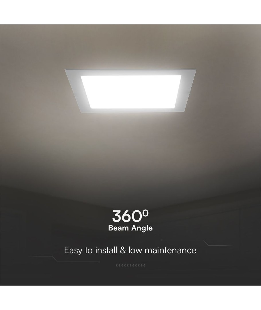 De afmetingen van het paneel zijn 295 x 28,6 x 295 mm, waardoor het compact maar toch krachtig is. Daarnaast toont het een strak vierkant design dat gemakkelijk in elke ruimte te integreren is. De IP20-classificatie geeft aan dat het niet waterbestendig is, waardoor het het beste geschikt is voor droge omgevingen.