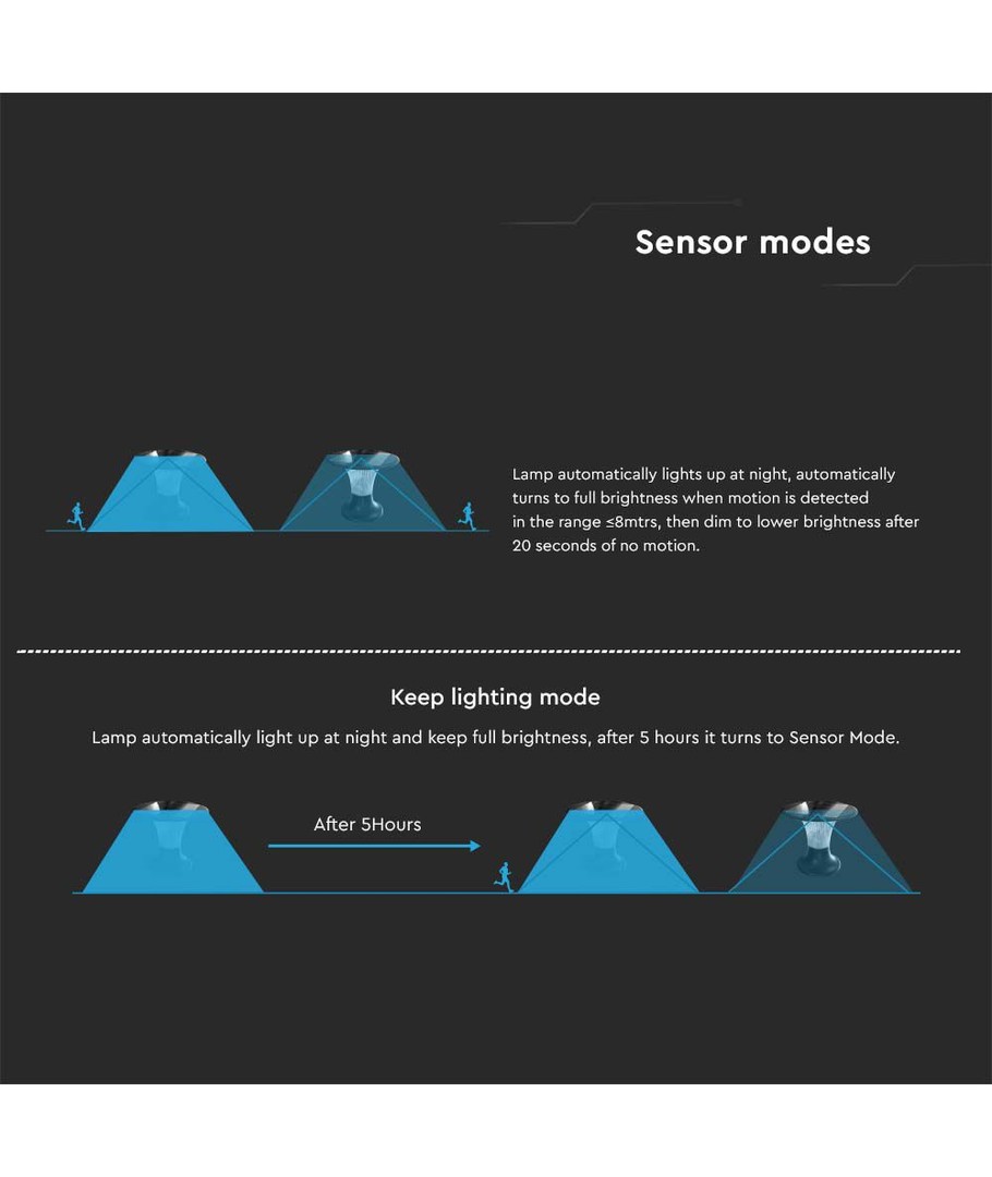 | Aanvullende opmerkingen | Battery: 3.2V LifePO4 6000mAh Battery. Charging time: 7 Hours Sunlight Charging. Working time: Min 80 Hours. Sensor distance: |