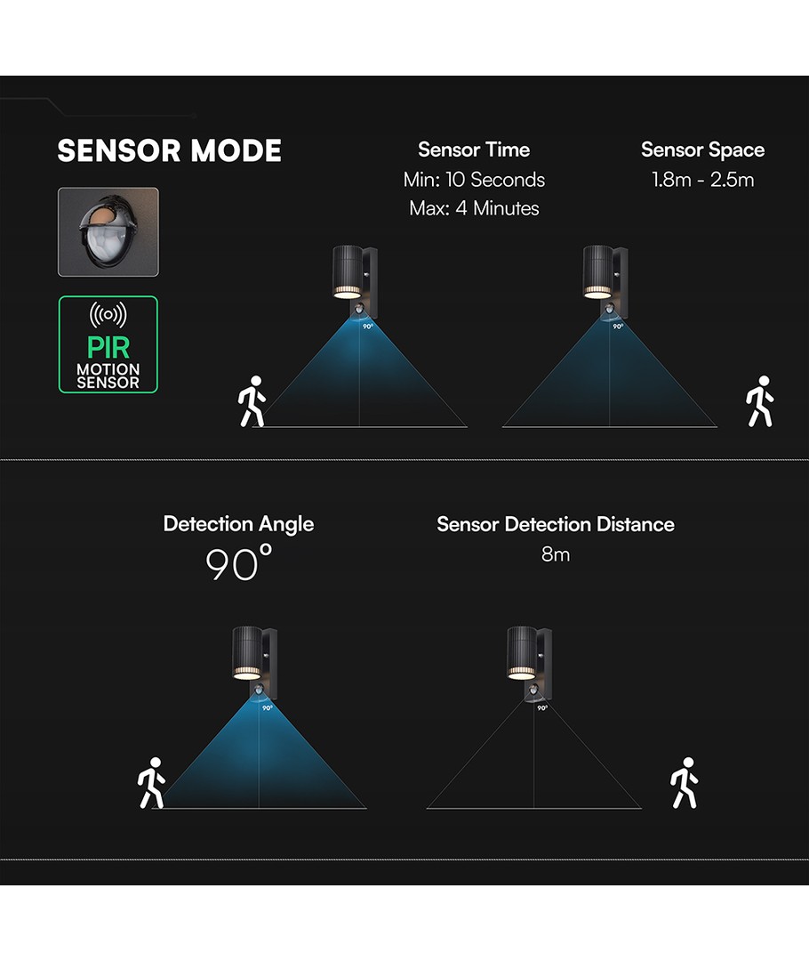 | Aanvullende opmerkingen | Sensor type: PIR. Sensor angle: 90°. Sensor distance: 8 Meters. |