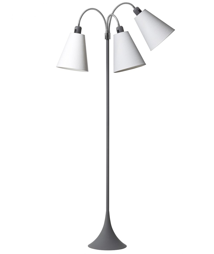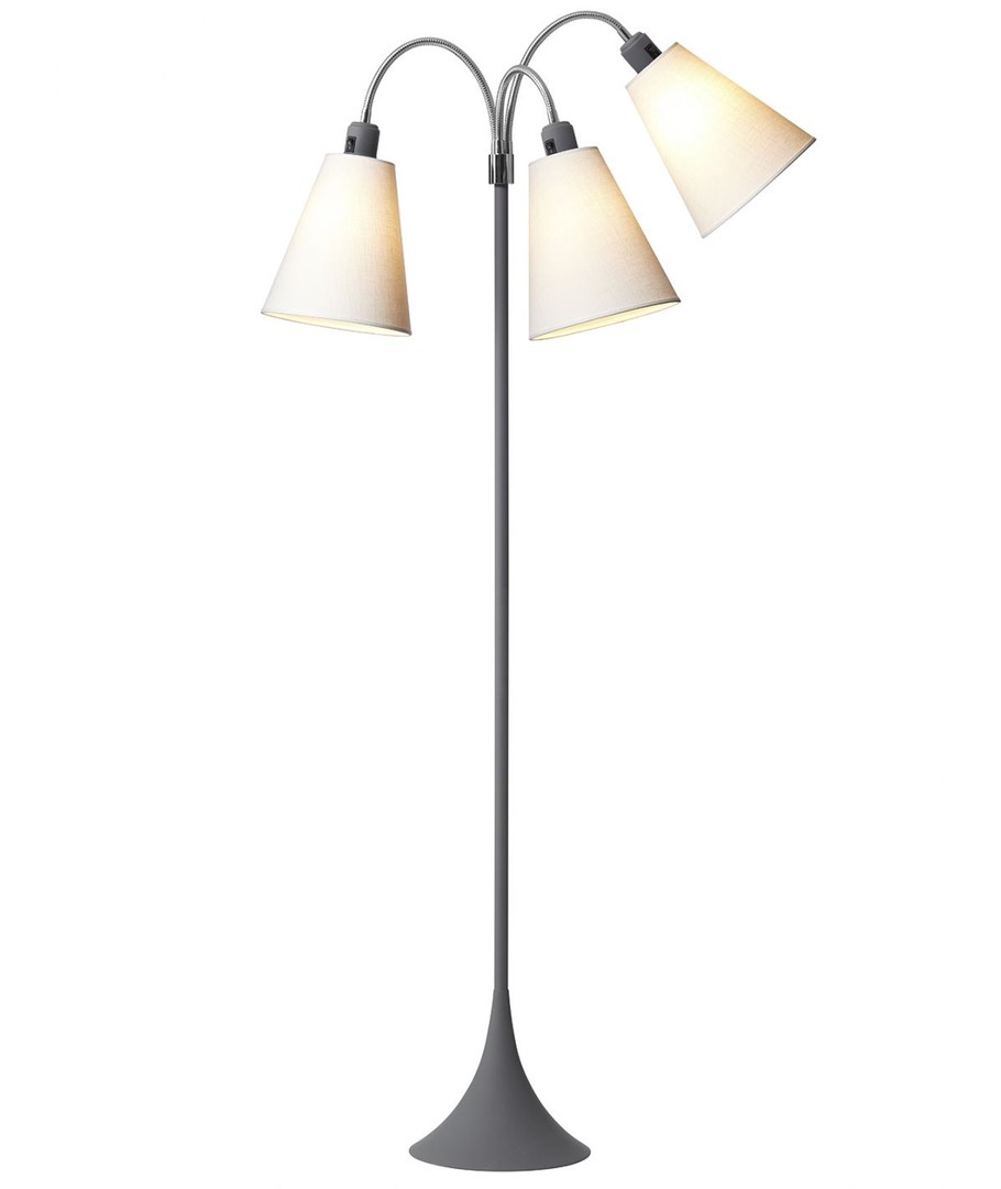 Vloerlamp van Nielsen Light met 3 flexibele halzen in chroom, waardoor deze gemakkelijk te gebruiken is voor lezen en andere zaken.