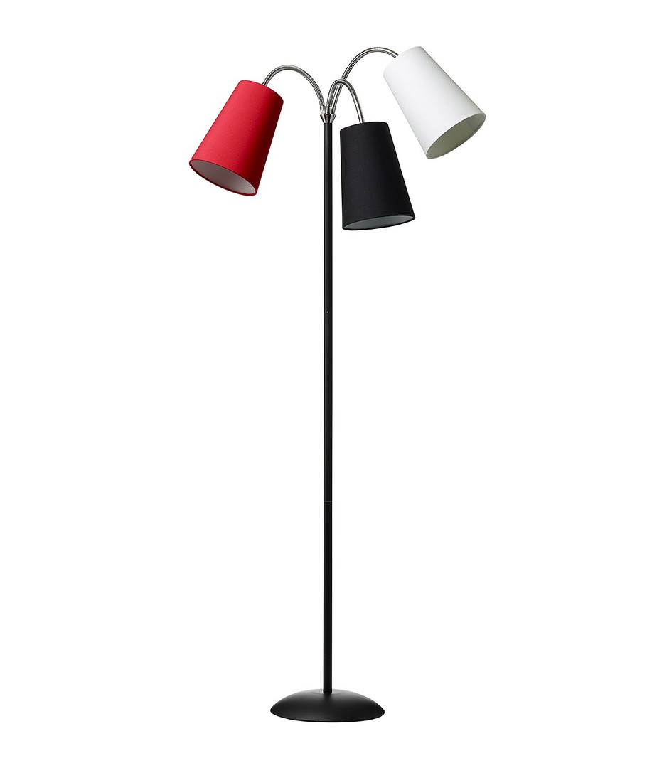 Salsa Vloerlamp van het Deense Nielsen Light heeft een zwarte voet en drie stoffen kappen in de kleuren zwart, wit en rood.