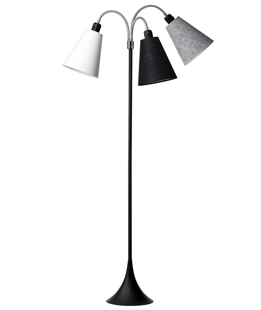 Een extra Classy vloerlamp in elegant design, met 3 kappen in verschillende, gedempte kleuren.