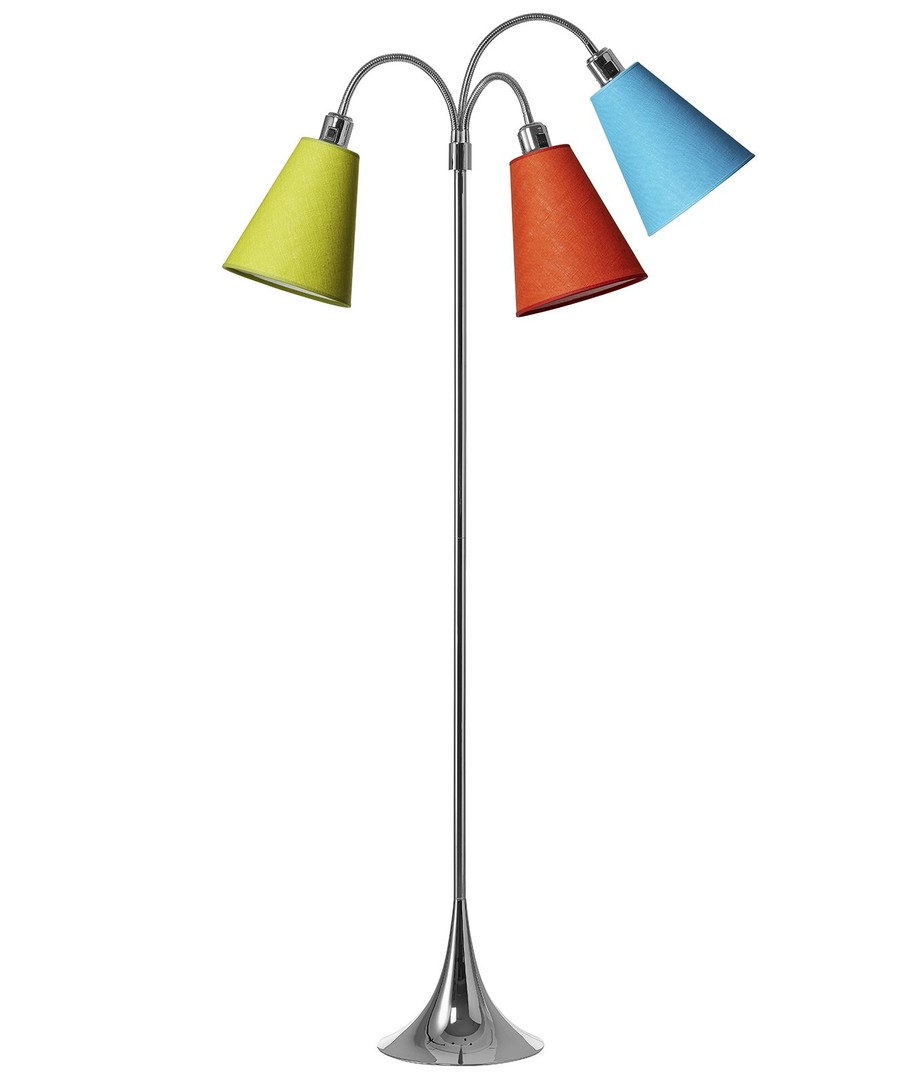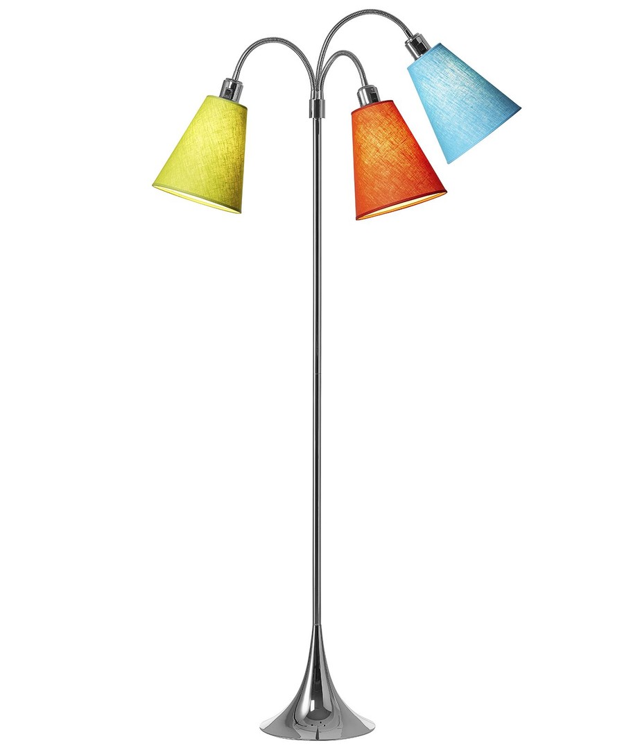 Een feestelijke vloerlamp in een elegant design, met 3 kappen in verschillende, bonte kleuren.