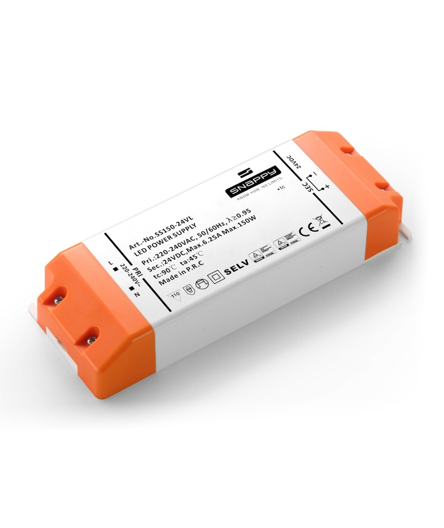 Kwaliteits LED driver van Snappy van 1-150W die een constante spanning van 24V DC levert. Niet aanbevolen voor LED lampen.