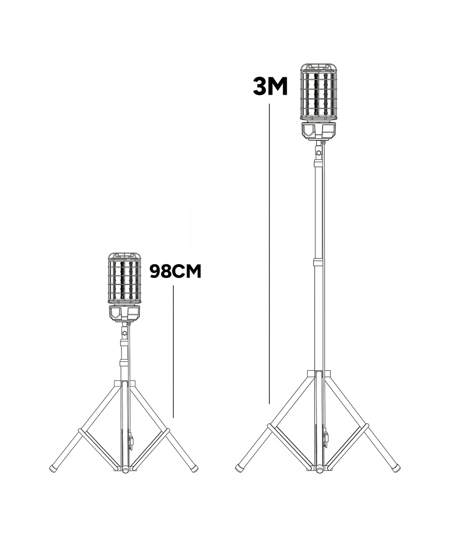 3,4m Statief: Wordt voorgemonteerd geleverd op een verstelbaar statief dat eenvoudig uitklapt en snel in hoogte verstelbaar is.